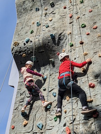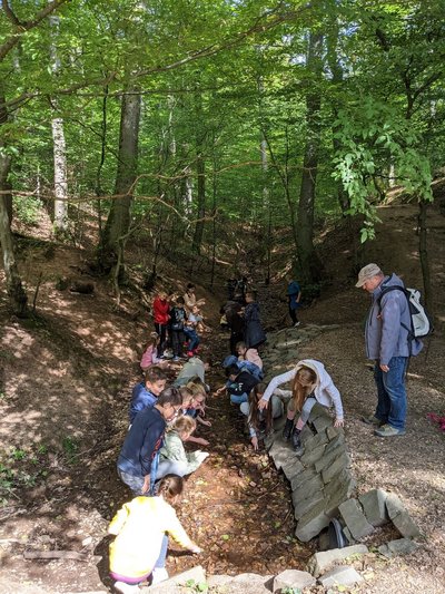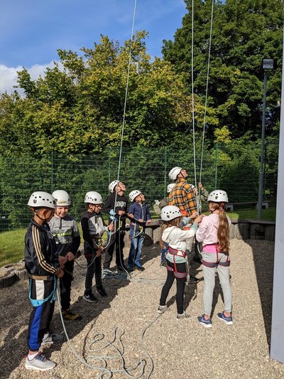 Zunächst stand für eine Klasse drei Stunden Klettern am 10 m hohen Kletterturm des EPZ auf dem Programm. Dabei stand nicht nur das Klettern selbst im Vordergrund, sondern auch das gegenseitige Sichern und Anfeuern. Die andere Klasse war in dieser Zeit im anliegenden Wald unterwegs: nach einigen Kooperationsspielen lernten die Schülerinnen und Schüler viel über den Wald, folgten einem Bachlauf bis zu seiner Quelle, bemalten sich mit selbst gefundenen Rödelsteinen, bauten ein Waldsofa, uvm…