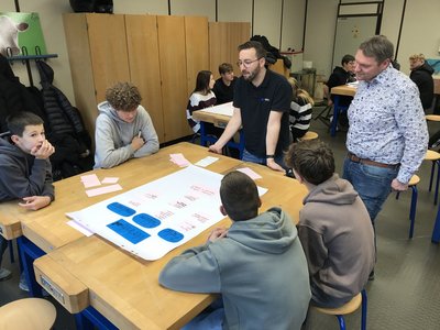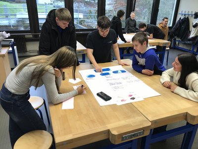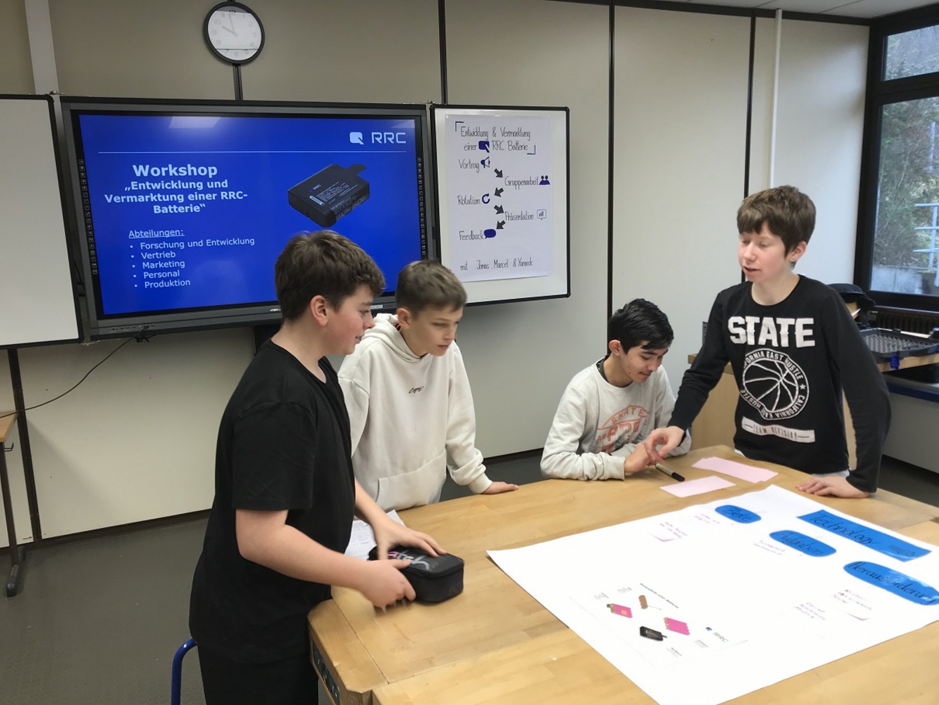 Anschließend starteten wir das gemeinsames Projekt „Entwicklung und Vermarktung einer RCC-Batterie“, dessen Aufgabenstellungen es in mehreren Gruppen „rotierend“ zu bearbeiten galt. Jede Gruppe beschäftigte sich z.B. mit Batterietechnik, Marketing oder dem Unternehmen selbst. Während der intensiven Arbeitsphase standen Herr Wolf mit Marcel und Yannik jederzeit für Fragen zur Verfügung. Sie halfen uns bei technischen Details, gaben Hinweise zur Recherche und unterstützten uns dabei, unsere Ideen zu strukturieren und zu verbessern.