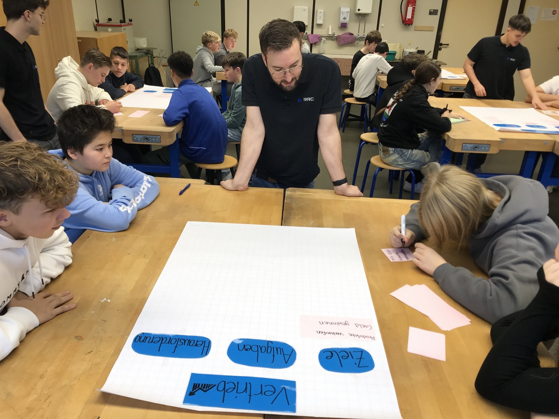 Am Freitag, den 05. Dezember 2025, besuchte uns Schülerinnen und Schüler der Klassenstufen 9 und 10 im Rahmen des Faches Wirtschaft und Technik die Firma „RRC power solutions“ aus Homburg. Einer der Gäste war der Ausbildungsleiter des Unternehmens, Jonas Wolf. Unterstützt wurde er durch Marcel Prisser, zurzeit in Ausbildung zum „Elektriker für Geräte – und Systemtechnik“, und Yannik Uhl, der sein „Duales Studium“ im Bereich BWL/Handel absolviert.