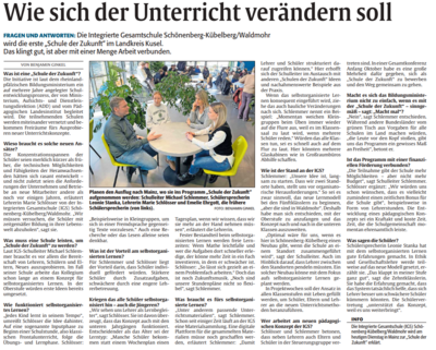 Eine Abordnung der IGS, allen voran der neue Schulleiter Dr. Michael Schlemmer, waren persönlich in Mainz vor Ort, um sich quasi den Startschuss abzuholen für ein neues pädagogisch-didaktisches Konzept: “Schule der Zukunft”? Aber was wird sich konkret ändern? Lesen Sie selbst in diesem Zeitungsartikel.