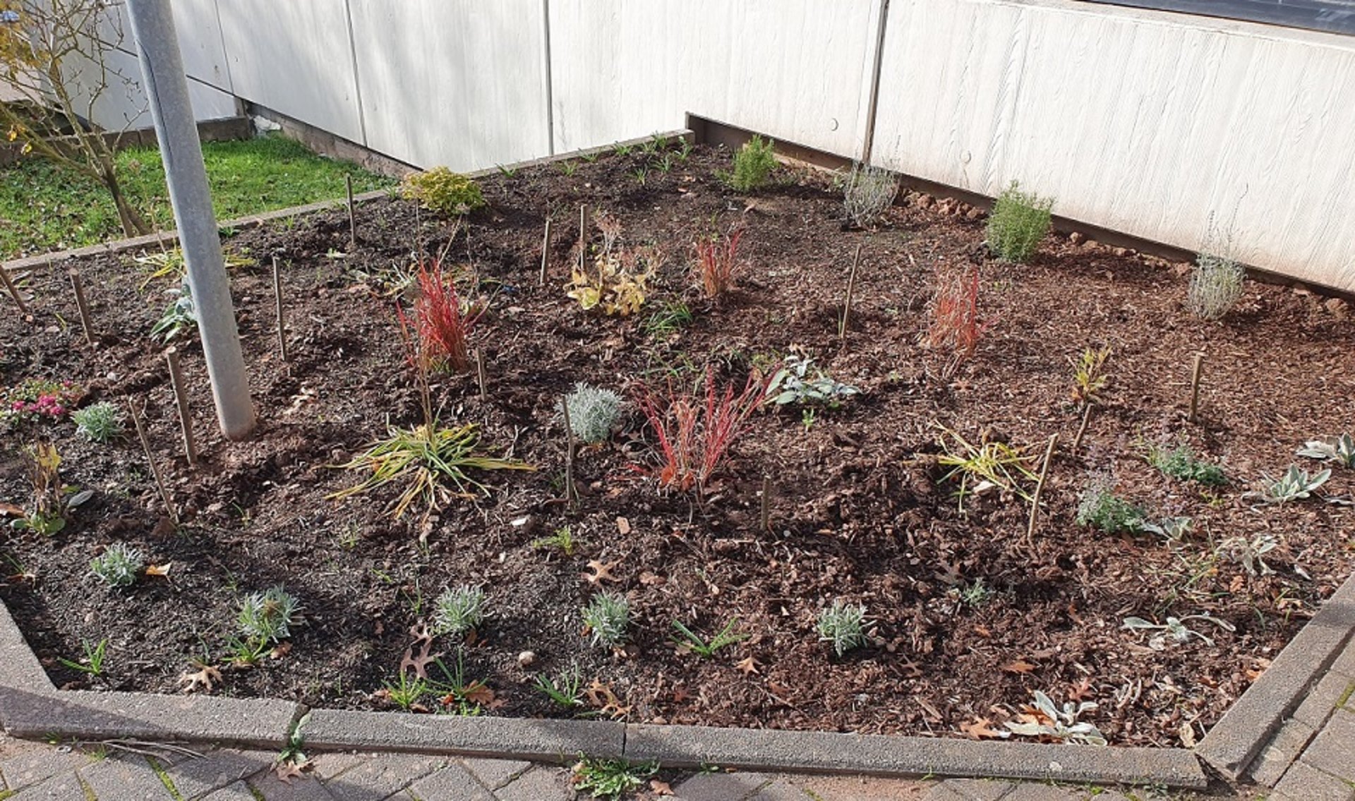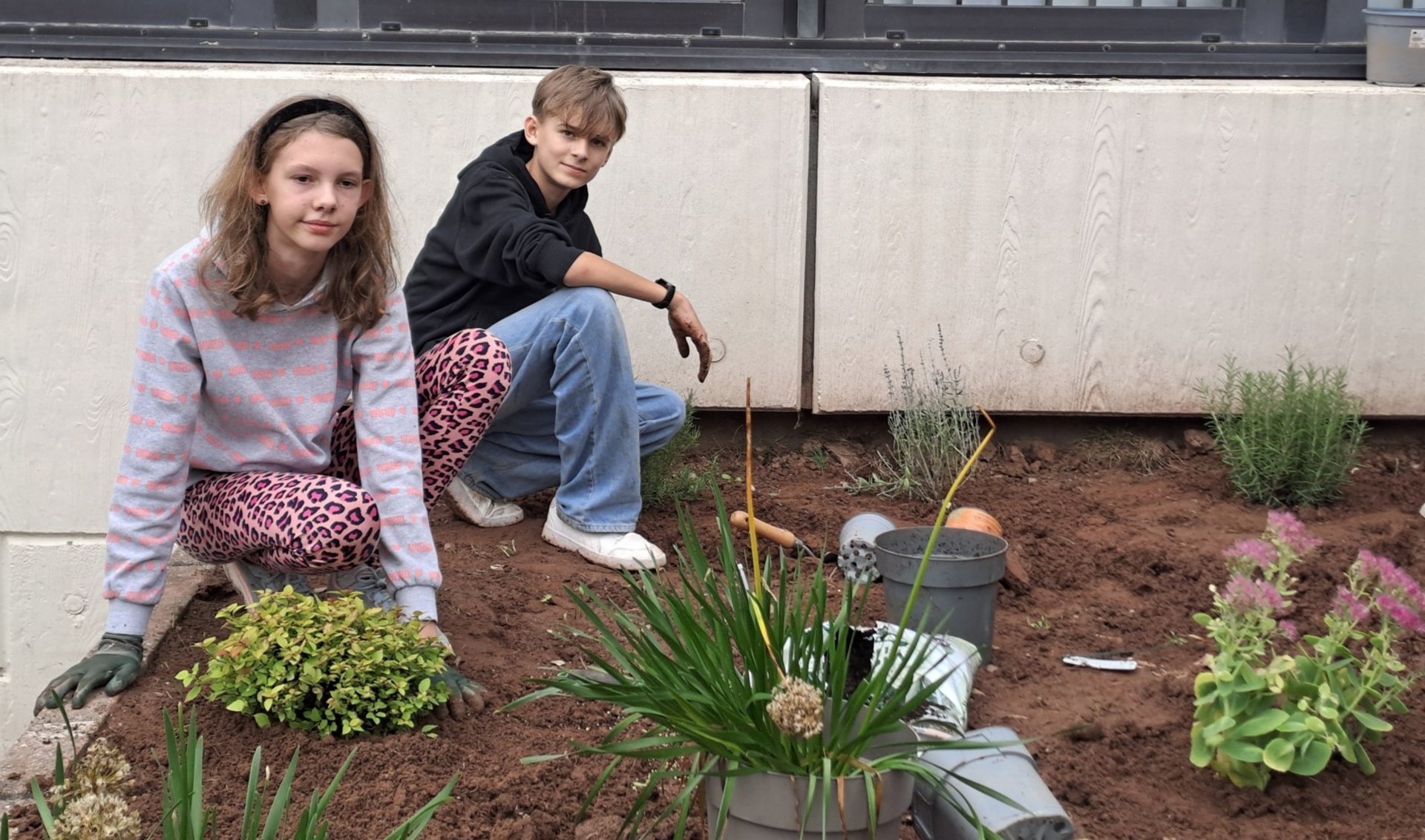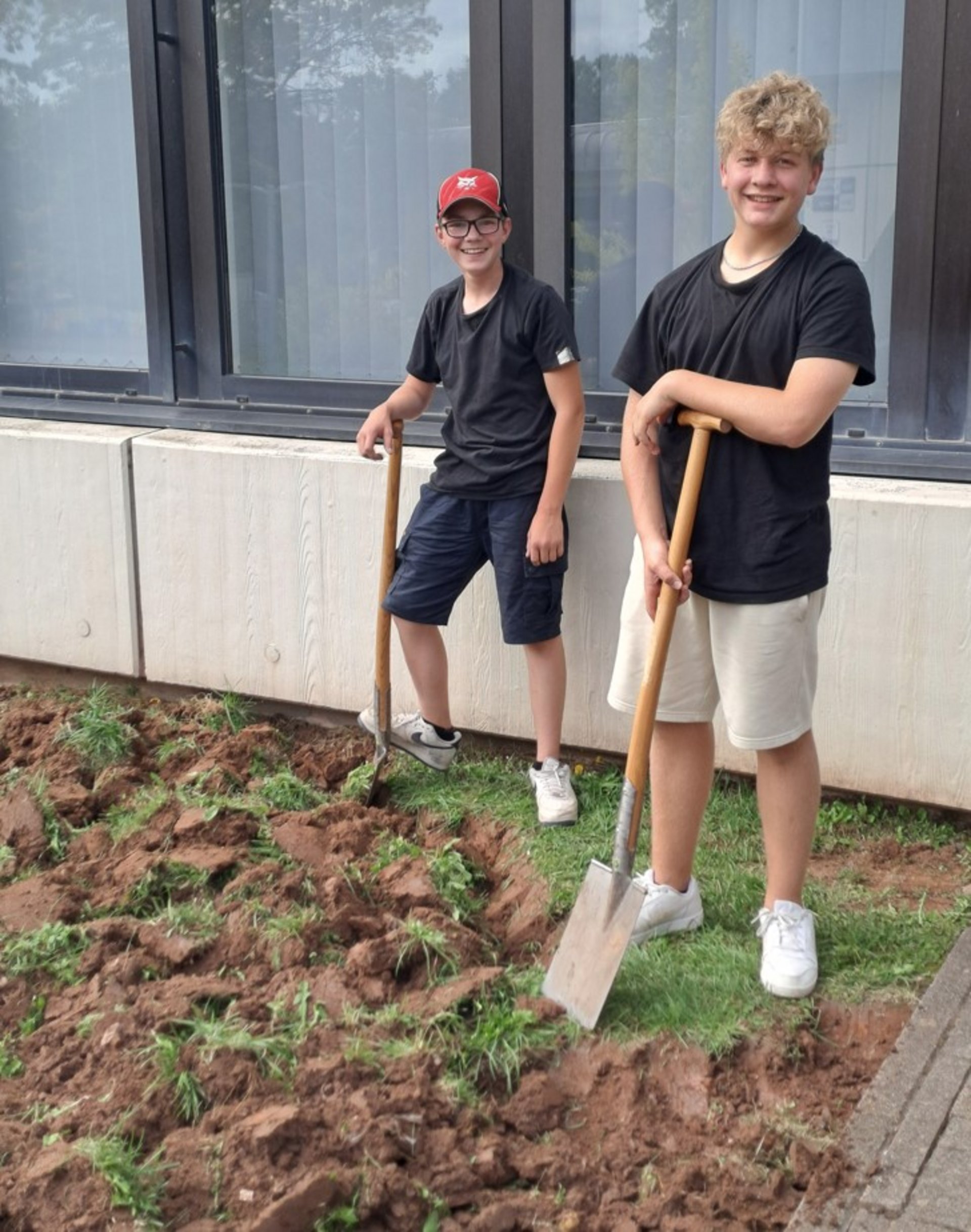 Darüber hinaus hat sich am Haupteingang der Schule einiges getan. Innerhalb kurzer Zeit verwandelten Ben und Samuel eine langweilige Rasenfläche in ein Blumenbeet. Mit tatkräftiger Unterstützung vieler Helferinnen wurden Grasreste sorgfältig entfernt und anschließend bienenfreundliche Stauden sowie zahlreiche Blumenzwiebeln gesetzt. Eine abschließende Schicht Rindenmulch schützt nun die frische Pflanzung vor Unkraut. Im kommenden Frühjahr wird das neue Beet in voller Blüte stehen und Besucherinnen und Besucher der Schule mit einem farbenfrohen Anblick begrüßen. Auch die Schulbienen dürfen sich über das zusätzliche Nahrungsangebot freuen.