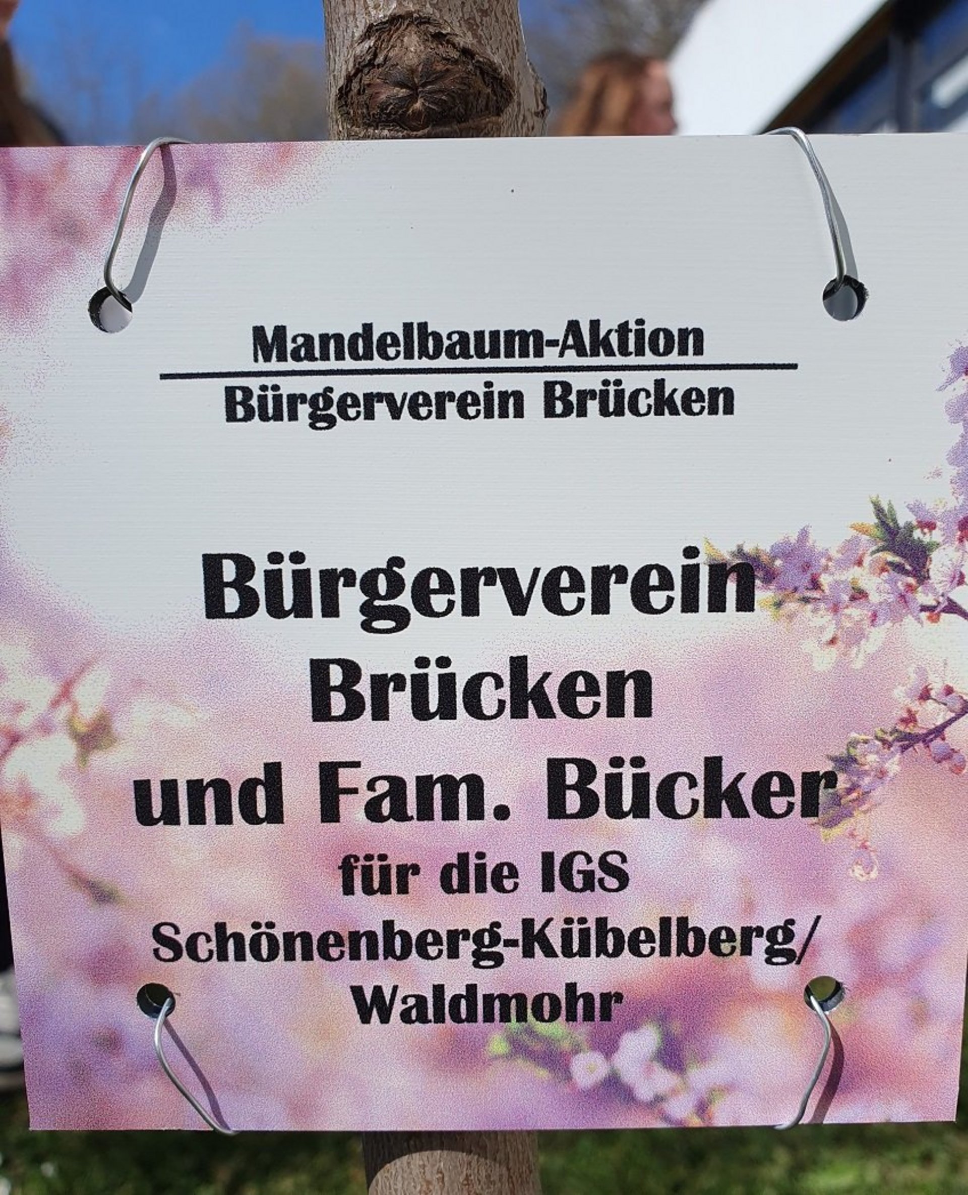 Durch eine großzügige Baumspende des Bürgervereins Brücken und dem Engagement der Familie Bücker konnte mit Vertretern aus SV, SEB, Schulgarten-AG, Schulleitung und Personalrat zusammen mit der Familie Bücker am Donnerstag, dem 26.3.26 auf dem Schulgelände der IGS am Standort Schönenberg-Kübelberg ein Mandelbaum gepflanzt werden.