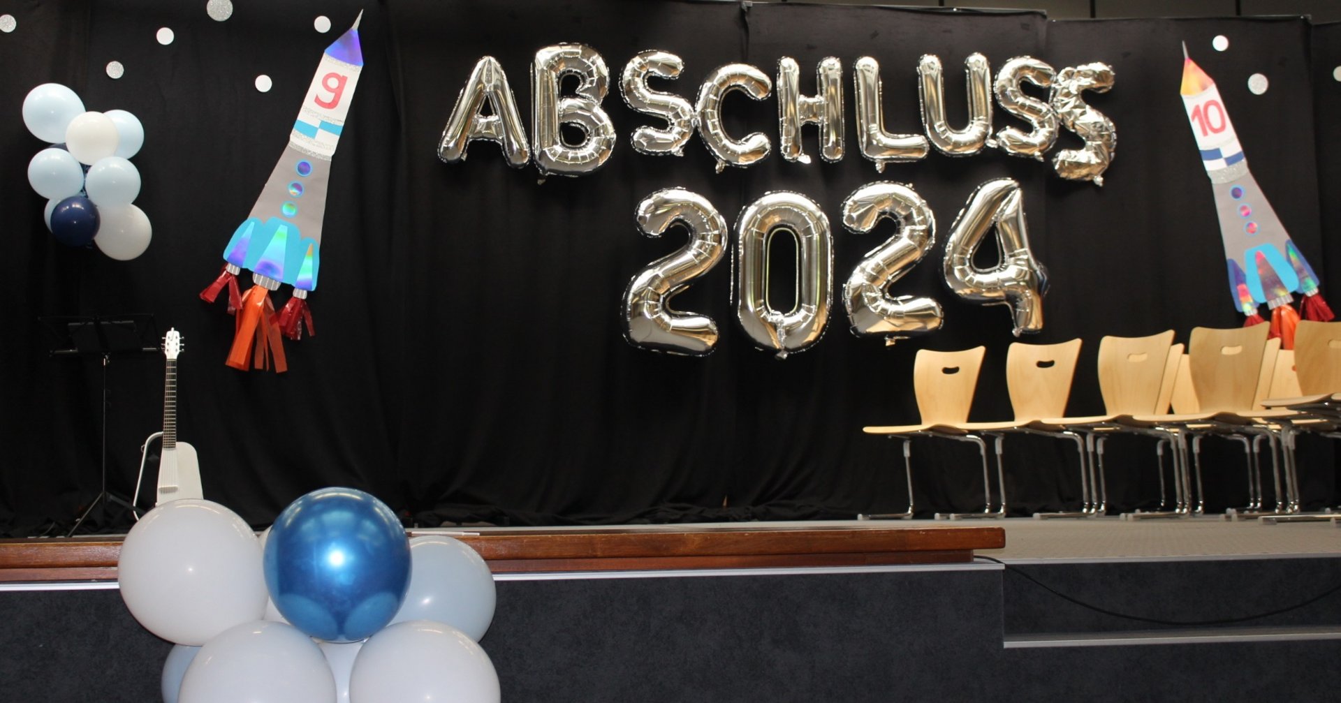 Die Feier wurde wie immer durch die Schulband „Phoenix“ musikalisch untermalt. Herr Steinberg hielt die Eröffnungsrede, in der er natürlich auf das Motto „Völlig losgelöst“ Bezug nahm und immer wieder auf den Text des Titels „Major Tom“ verwies. Danach durften natürlich Grußworte der Kreisverwaltung, vertreten durch Herrn Flohr, und des Verbandsbürgermeisters Herrn Christoph Lothschütz nicht fehlen. Und auch unser Förderer Wolfgang Hutzel ließ es sich nicht nehmen und betonte, dass die Jugend doch besser sei als ihr Ruf. Begeistert schilderte er seine Begegnung mit Schülerinnen und Schülern, die aktuell den Schulgarten gestalteten und professionell Pflastersteine ins Fundament einbrachten. Er machte Mut, sich bei der Berufswahl für das Handwerk zu entscheiden. Nach der Zeugnisvergabe kam es wie in jedem Jahr auch wieder zu Ehrungen. Dabei erhielten Marielle Hauf, Leon Kopp, Michelle Wimmer und Emily Kolberg jeweils ein Geldgeschenk von der Kreissparkasse Kusel, vertreten durch Herrn Braun. Marielle Hauf erhielt als Jahrgangsbeste eine weitere Belohnung, gespendet von der Hutzel-Stiftung, die auch die Urkunde der Ministerin für soziales Engagement an Aylin Weiß mit einem Geldschein ergänzte. Und Malina Weisenauer, Abgängerin mit dem Abschluss Berufsreife, erhielt einen Buchgutschein, gestiftet von der Volksbank Glan-Münchweiler vertreten durch Frau Karch, für gute Leistungen in den naturwissenschaftlichen Fächern.